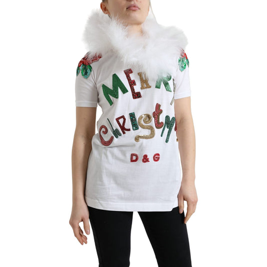 Dolce & Gabbana White Cotton Christmas Sequin Fur T-shirt