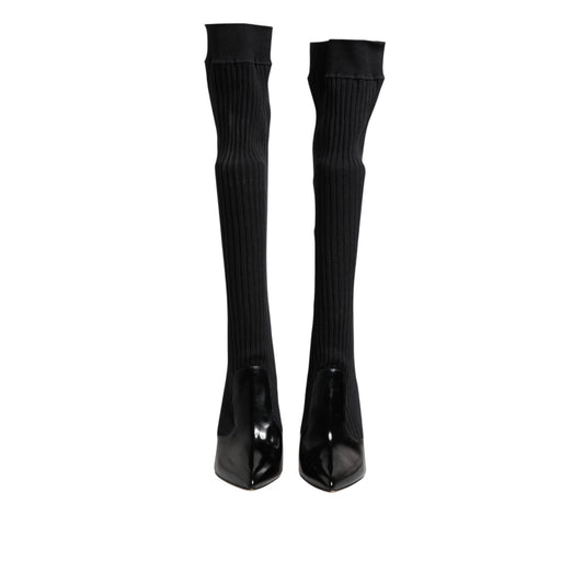 Dolce & Gabbana Black Leather Ribbed Knit Knee Boots Shoes