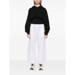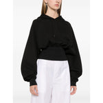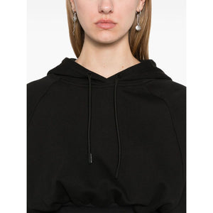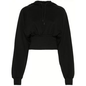 black organic cotton jersey texture cropped slouchy drawstring hood long raglan sleeves logo print at the sleeve French terry lining ribbed cuffs and hem Organic cotton cropped hoodie Size and Fit - This piece fits true to size. We recommend you get your regular size. Model is 1,75m / 5ft 8in wearing size S