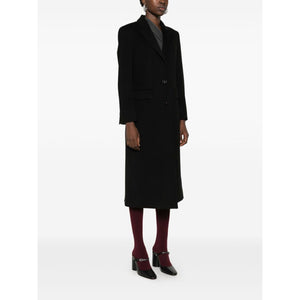 black virgin wool front button fastening peak lapels shoulder pads long sleeves buttoned cuffs chest welt pocket two side flap pockets central rear vent logo-jacquard lining straight hem mid-length Wool single-breasted coat Size and Fit - This piece fits true to size. We recommend you get your regular size. Model is 1,75m / 5ft 8in wearing size 40 (IT)