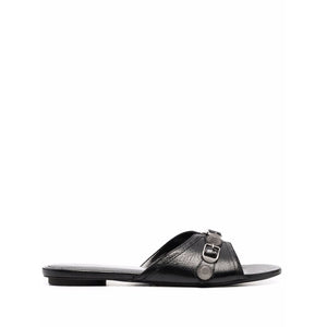 Black leather Cagole leather sandals from BALENCIAGA featuring leather lining, decorative buckle detail, open toe, slip-on style, branded insole and low heel. Le Cagole leather flat sandals Size and Fit - Heel 0,6 in / 1,5 cm