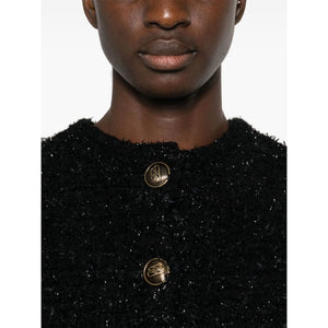 black cotton blend bouclé construction metallic threading crew neck long sleeves two front patch pockets logo-embossed buttons cropped full lining straight hem front button fastening Bouclé cropped jacket Size and Fit - BUST: 68.0 Centimetres. LENGTH: 44.0 Centimetres. WAIST: 64.0 Centimetres. SLEEVE LENGTH: 78.0 Centimetres. Shoulder Width: 36.0 Centimetres.