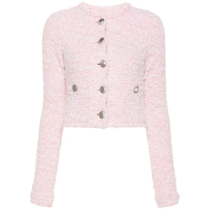 blush pink cotton blend tweed round neck long sleeves two side button-fastening pockets logo-embossed buttons front button fastening straight hem Bouclé cropped jacket Size and Fit - SLEEVE LENGTH: 78.0 Centimetres. LENGTH: 44.0 Centimetres. WAIST: 64.0 Centimetres. BUST: 68.0 Centimetres. Shoulder Width: 36.0 Centimetres.