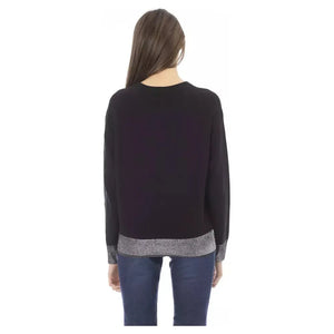 Elevate your style game with the Baldinini Trend Sweater. Exclusively crafted in Italy, this chic black pullover features long sleeves and a classic crew neck, accentuated by a Baldinini Trend monogram in gleaming metal for that luxe touch. Experience the sumptuous blend of wool, viscose, cashmere, and nylon that hugs your silhouette. Ribbed detailing on the neck, cuffs, and hem add a textured dimension to this timeless piece.