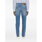 indigo blue stretch-cotton washed denim whiskering effect at the thighs embroidered logo to the front logo patch to the rear contrast stitching slim cut mid-rise button fly fastening belt loops classic five pockets Denim cotton jeans