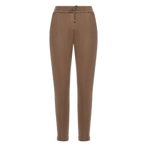 brown elasticated waistband side pockets tapered leg Cotton and silk blend trousers Size and Fit - This piece fits true to size. We recommend you get your regular size. Model is 1,75m / 5ft 8in wearing size S