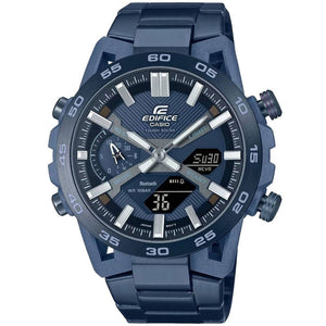 CASIO EDIFICE Mod. SOSPENSIONE Tough Solar Bluetooth® wristwatch with blue dial and stainless steel strap.