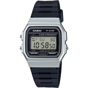 CASIO VINTAGE Mod. F-91 BIO RESIN STRAP - SILVER with black resin strap, unisex wristwatch, 35mm case, 3 ATM water resistance.