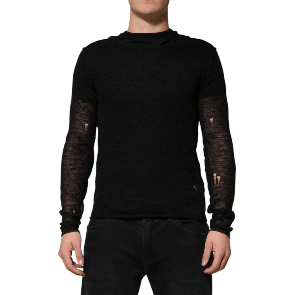 Dolce & Gabbana Black Linen Mesh Tattered Longsleeves T-shirt
