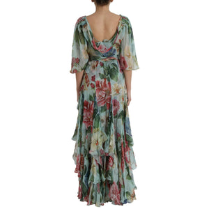 Dolce & Gabbana Blue Floral Print Tiered Long Maxi Dress