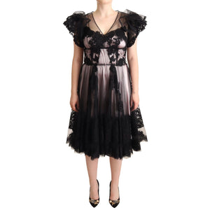 Dolce & Gabbana Black Pink Floral Lace A-line Midi Sheer Dress