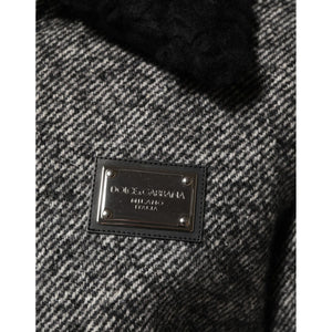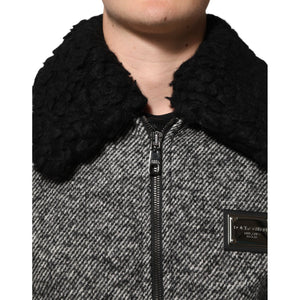 Dolce & Gabbana Gray Wool Herringbone Shearling Collar Bomber Jacket