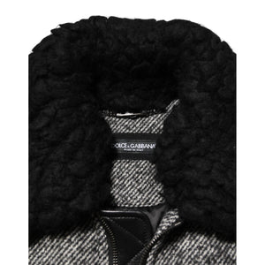 • Dolce & Gabbana Gray Wool Herringbone Shearling Collar Bomber Jacket