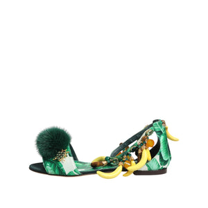 Dolce & Gabbana Green Mink Fur Satin Banana Leaf Sandals Shoes