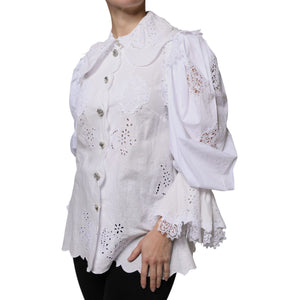 Dolce & Gabbana White Cotton Lace Trim Collared Blouse Top