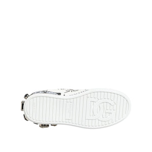 Gorgeous brand new, 100% Authentic Dolce & Gabbana sneakers feature a white leather upper, a rubber sole, lace-up closure, and are adorned with various rhinestone and crystal applications, along with graffiti-inspired print details.
