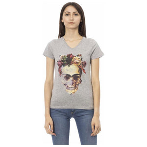 Elevate your style with the chic simplicity of Trussardi Action’s Short Sleeve T-Shirt. Crafted with a blend of plush cotton and viscose, this tee promises unrivaled comfort and breathability. Its sleek gray hue and eye-catching front print add a dash of elegance to the classic V-neck design. Perfect for the fashion-forward woman who enjoys a blend of casual ease and trendy sophistication.