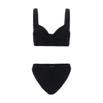 Bonnie Swimsuit by Hunza G, bandeau top piece with wide straps, smock stitch creates sweetheart neckline on front, high-waisted bottom, stretchy monochrome pattern.