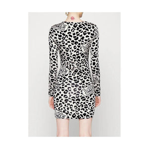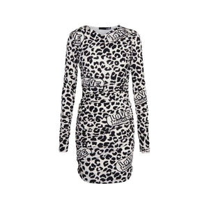 Unleash your bold elegance with the Love Moschino short dress, a perfect amalgamation of vivacity and style. This head-turner features a striking red leopard print illuminated by the iconic all-over Love Moschino logo. Fashioned with a flirtatious V-neck and playful ruffle accents on the front and sleeves, the snug fit of this Italian-crafted masterpiece accentuates your silhouette. It’s a piece that exemplifies Love Moschino’s trendy and audacious attitude, destined to spark conversation and turn heads in any setting.