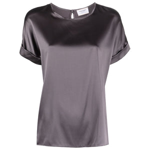 short-sleeve silk blouse from SNOBBY SHEEP featuring anthracite grey, silk blend, satin finish, crew neck, rear button fastening, short sleeves and straight hem. Silk crewneck shirt Size and Fit - This piece fits true to size. We recommend you get your regular size. Model is 1,75m / 5ft 8in wearing size 40 (IT)