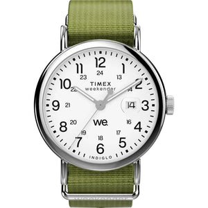 TIMEX MOD. WEEKENDER watch with a classic white dial and green strap, featuring easy-to-read numerals and date display.