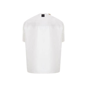 Emporio Armani Over Tunic Sweater in white with beige interior, round neck, wide short sleeve, fastening at neck with hidden snaps, small slits on side, rubber logo applied on back. Composition: 100% Cotton-Sku inside:23MG138-142